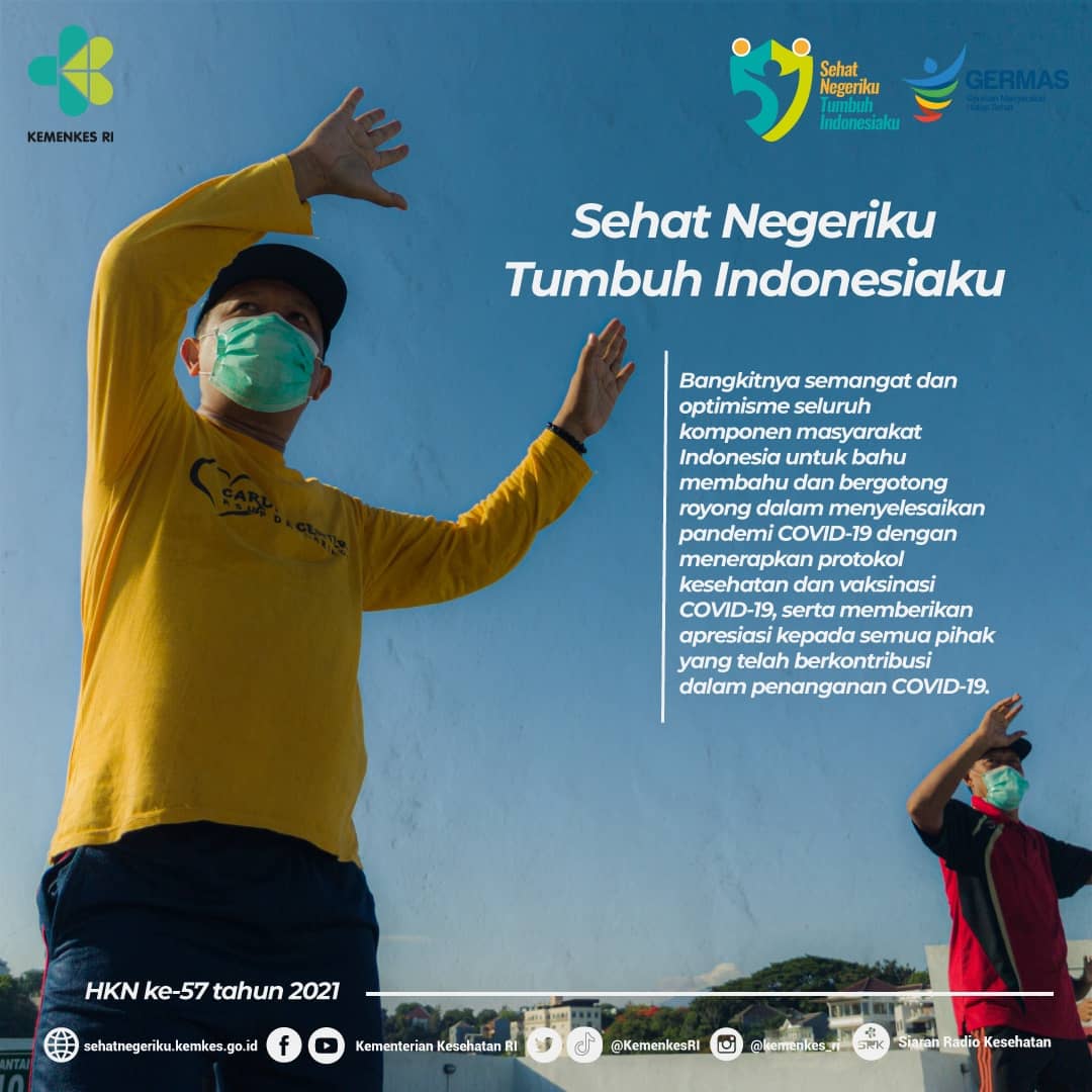 Tema peringatan HKN ke-57 Tahun 2021 adalah “Sehat Negeriku, Tumbuh Indonesiaku” yang menggambarkan mulai bangkitnya semangat dan optimisme seluruh masyarakat untuk saling bahu membahu menyelesaikan pandemi COVID-19 melalui penerapan protokol kesehatan terutama kepatuhan memakai masker dan vaksinasi COVID-19.