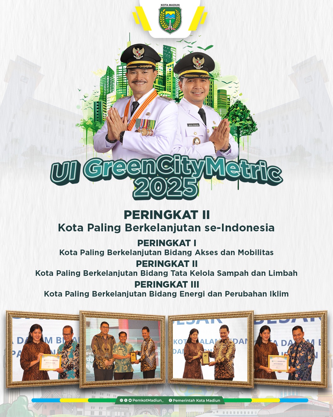Selamat kepada Kota Madiun atas diraihnya sederet penghargaan pada UI GreenCityMetric 2025.